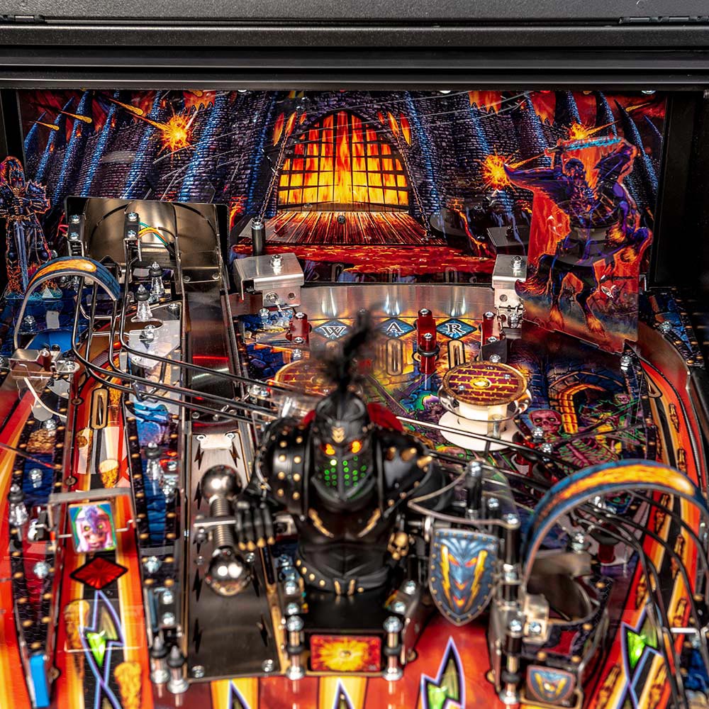 Stern’s Black Knight: Sword of Rage Pro, Premium, and Limited Edition models feature stunning and distinctive hand-drawn art in homage to this pinball icon. Each game features a custom sculpted, interactive, and multi-functional Black Knight bash toy. This interactive Black Knight toy features a bi-directional motorized flail, a glowing RGB helmet with individually controllable expressive lighting to interact and taunt players with custom speech, and a sliding coil-driven shield that will bash and block your shots.