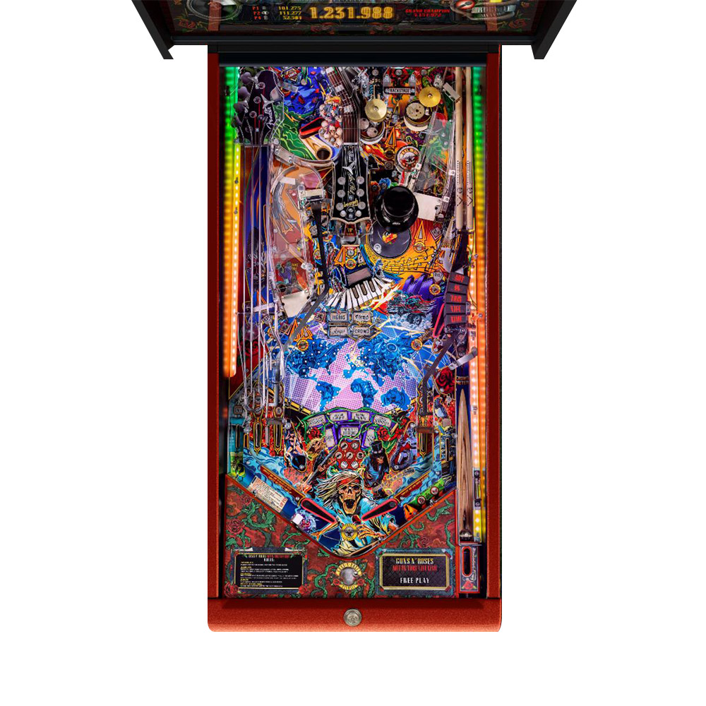 Pinball industry leader, Jersey Jack Pinball has partnered with legendary rock sensation, Guns N’ Roses to bring the “Not In This Lifetime…Tour” concert experience to you! Packed with features such as a real drum stick ramp, platinum record spinning toy, guitar pick spinners, hand-sculpted figures, articulating spotlights and so much more! This kinetic work of art truly brings the concert alive with hundreds of LED lights, multiple LCD displays showing custom animations and hours of Not In This Lifetime…Tour concert footage while 21 full-length studio master tracks from Guns N’ Roses blast from the 120 Watt 2.1 stereo sound system! Will there ever be another Rock N Roll pinball experience like this? NOT IN THIS LIFETIME!