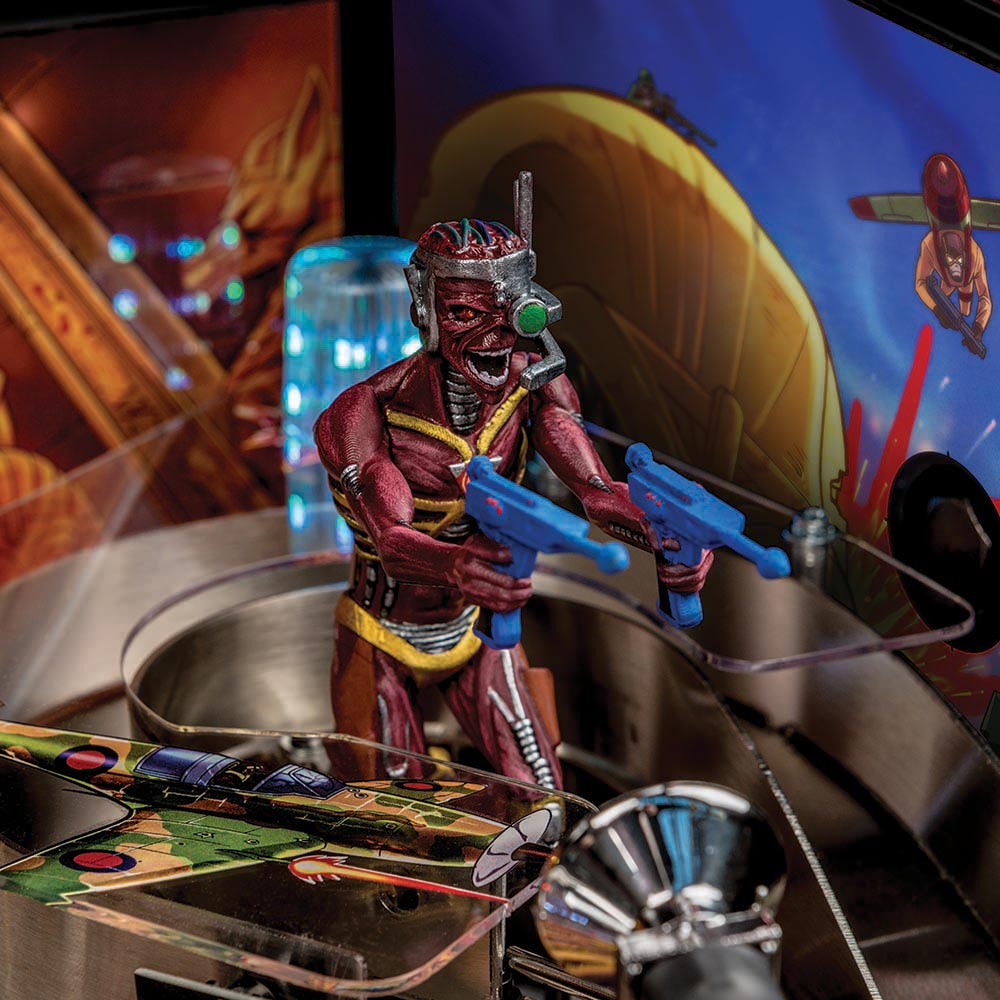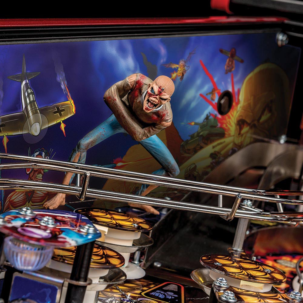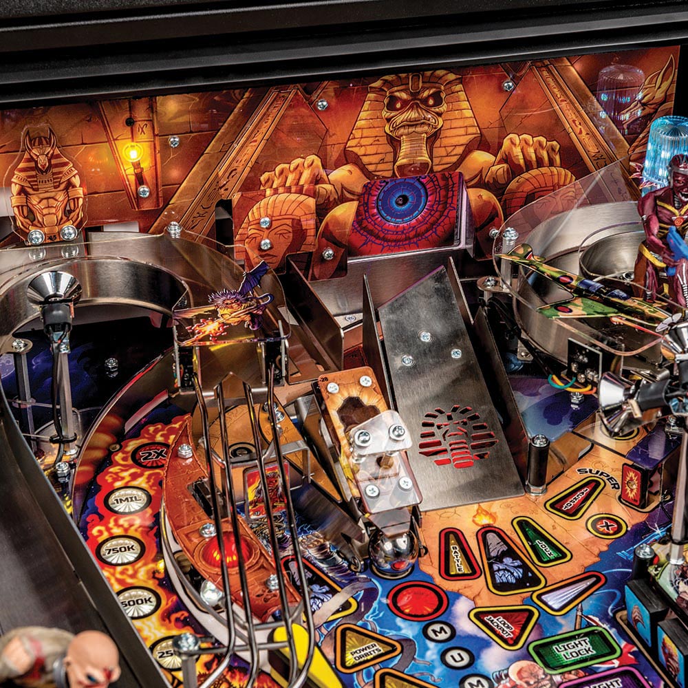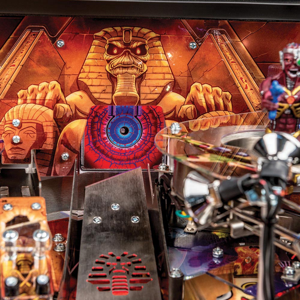 The Iron Maiden Premium and LE have new, unique, and innovative mechanisms. Included is a motor controlled tomb entrance feeding a motorized combination ball lock/Newton ball, which allows the player to physically knock a Newton ball onto the playfield to be an active multiball. A second new and unique device is a very cool omnidirectional ball target used in place of the Pro’s normal standup target. The Premium and LE are further enhanced by the jump ramp that opens to reveal a scoop, interactive chase