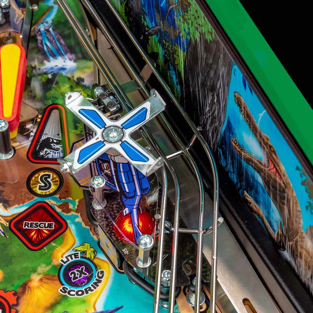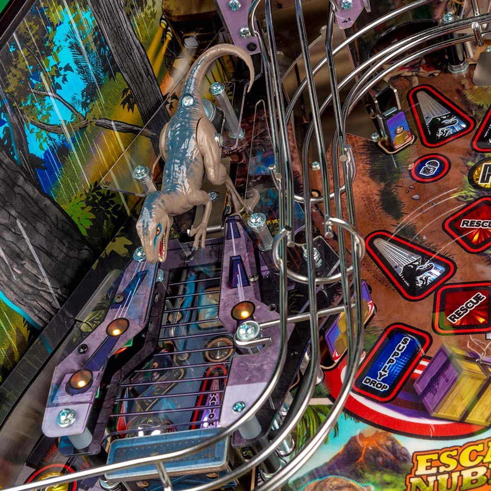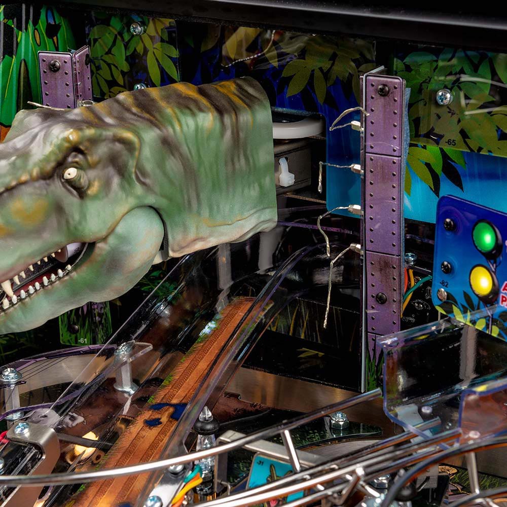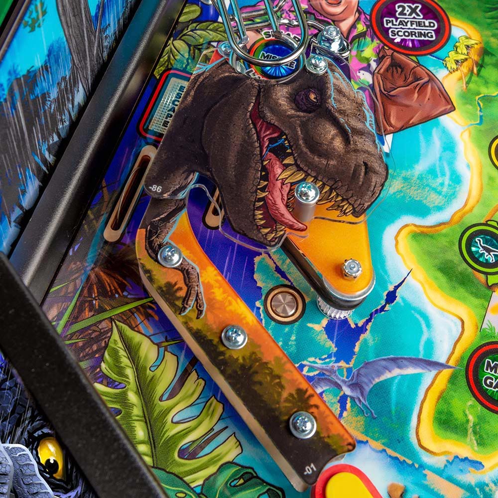 The Premium and Limited Edition models feature an amazing animatronic ball-eating, ballthrowing T. Rex that interacts with the ball and the player. These models also include an interactive Raptor and Raptor Pen featuring a ball-lock mechanism guarded by a motorized gate. The action does not let up with unique mosquito-in-amber pop bumpers and a custom metal horizontal helicopter spinner.
