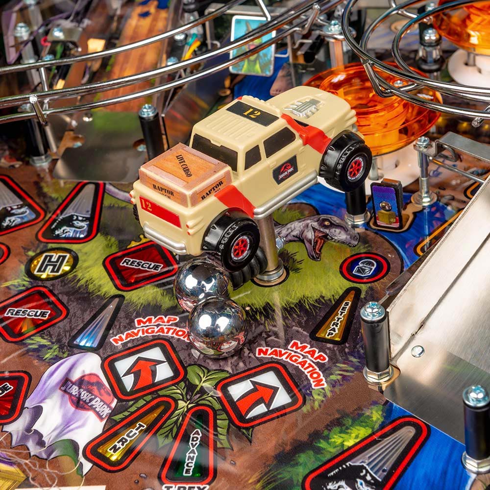 The Pro, Premium, and Limited Edition models also feature a Jungle Adventure Vehicle target in the middle of the playfield that is a spinning Newton Ball. This kinetic target registers direct hits, determines the direction players navigate on the island during gameplay, and lights T. Rex modes. All models include three full sized flippers, four custom ramps, a spinning “Spitter” target, in-lane up/down lock post that sets up critical playfield shots and distinctive hand-drawn art highlighting iconic dinosaurs from the series.