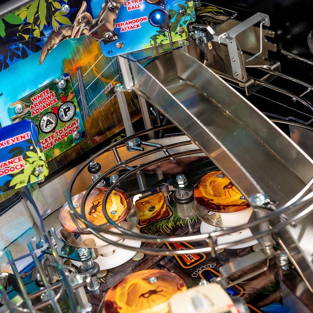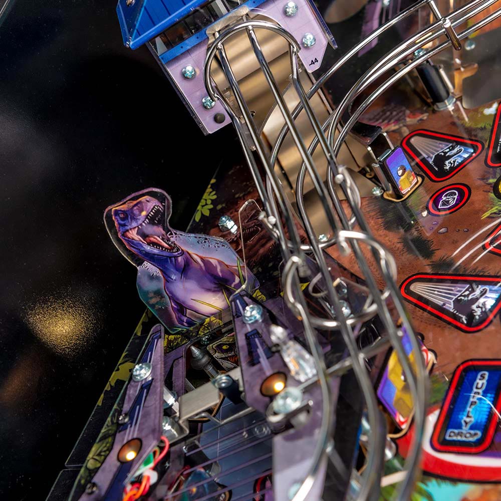The Premium and Limited Edition models feature an amazing animatronic ball-eating, ballthrowing T. Rex that interacts with the ball and the player. These models also include an interactive Raptor and Raptor Pen featuring a ball-lock mechanism guarded by a motorized gate. The action does not let up with unique mosquito-in-amber pop bumpers and a custom metal horizontal helicopter spinner.