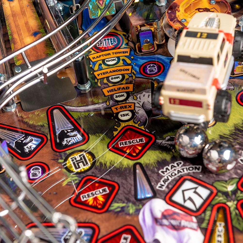 The Pro, Premium, and Limited Edition models also feature a Jungle Adventure Vehicle target in the middle of the playfield that is a spinning Newton Ball. This kinetic target registers direct hits, determines the direction players navigate on the island during gameplay, and lights T. Rex modes. All models include three full sized flippers, four custom ramps, a spinning “Spitter” target, in-lane up/down lock post that sets up critical playfield shots and distinctive hand-drawn art highlighting iconic dinosaurs from the series.