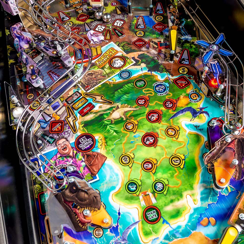 Like the blockbuster movie, the Jurassic Park pinball experience generates heart pounding excitement as the player progresses through the game. As the game starts, the player is transported to Isla Nublar, an amusement park where escaped dinosaurs are running amok!